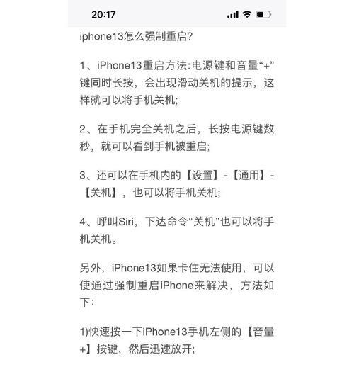 苹果13手机是目前市场上最为热门的手机之一,但是由于各种原因,我们有时候需要将手机重启一下,比如手机死机、应用无响应等问题。本文将为大家详细介绍苹果13手机的重启方法及注意事项,让你轻松解决手机问题。