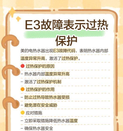 随着生活水平的提高,热水器成为人们家居生活中不可或缺的设备。然而,在使用中,热水器也会出现各种各样的问题,其中最常见的故障之一就是E3故障。对于很多用户来说,面对E3故障时不知道该如何解决。本文将详细介绍E3故障的原因和解决方案,帮助用户轻松应对热水器问题。