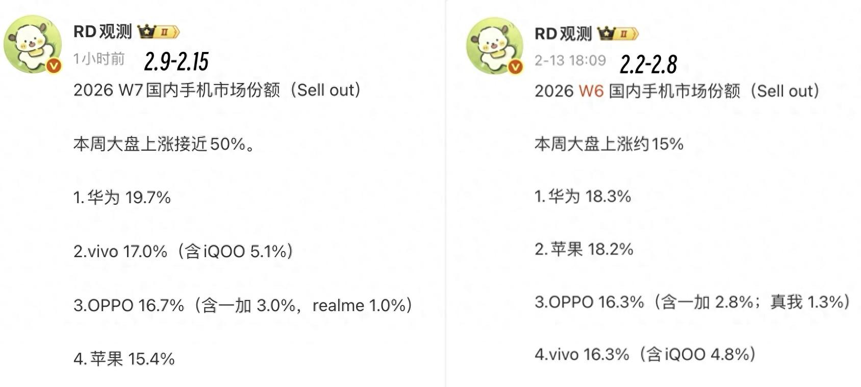 今天分享的是2026年W7国内手机排行榜,时间区间是2月9日到2月15日,本周大盘增长接近50%,原因就是农历春节将至。和上周榜单相比,本周的排名可以用重新洗牌来形容:苹果跌出前三名,vivo排名第二,华为排名第一且份额遥遥领先。