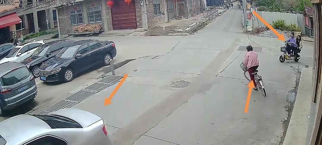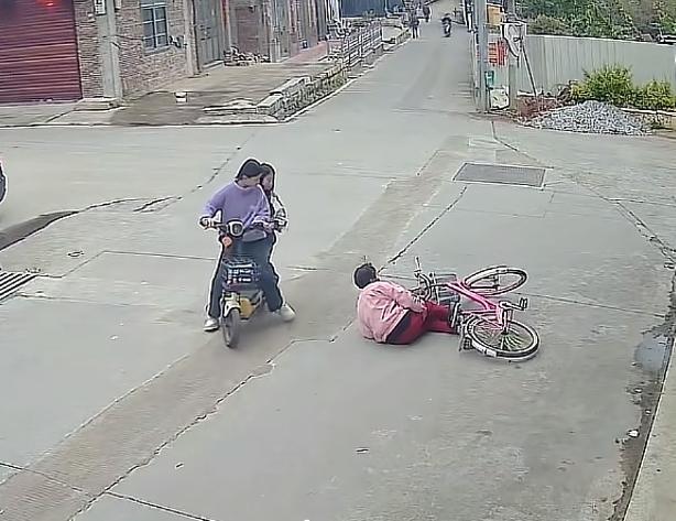 等小车开过去后,后边又有两个女生骑着电动车过来了,老人不知道是想拐弯还是要继续直行,反正在看到女生骑车过来后,车头一拐,随后直接摔倒。