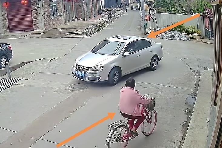 当时的监控清楚的拍下了事发时的情形,事情起因是,一名老太骑着自行车走到一拐弯处时,一辆小汽车从拐弯处开了过来,老太为了躲避小车,便向右边靠路边处骑了过去。