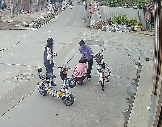 老人摔倒后,两女生将车骑到了老人身边,并且停了下来查看老人情况,两人一合计,就合计好了把摔倒的老人扶起来,也算是做好事了。