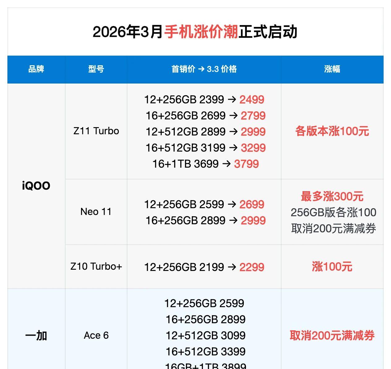 既然是必然现象,那么荣耀WIN RT肯定不会孤独,毕竟线上性价比机型不止这一款,红米、iQOO、一加和真我的相关产品都跑不掉,目前iQOO Z11 Turbo、iQOO Neo11、一加Ace 6等产品都已经涨价了,这对于很多等等党来说无疑是一顿暴击。