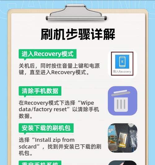 在准备好刷机包和刷机工具之后,就可以进入手机Recovery模式进行刷机操作了。进入Recovery模式的方式可能因手机型号而异,用户需要在网上查询相关信息。